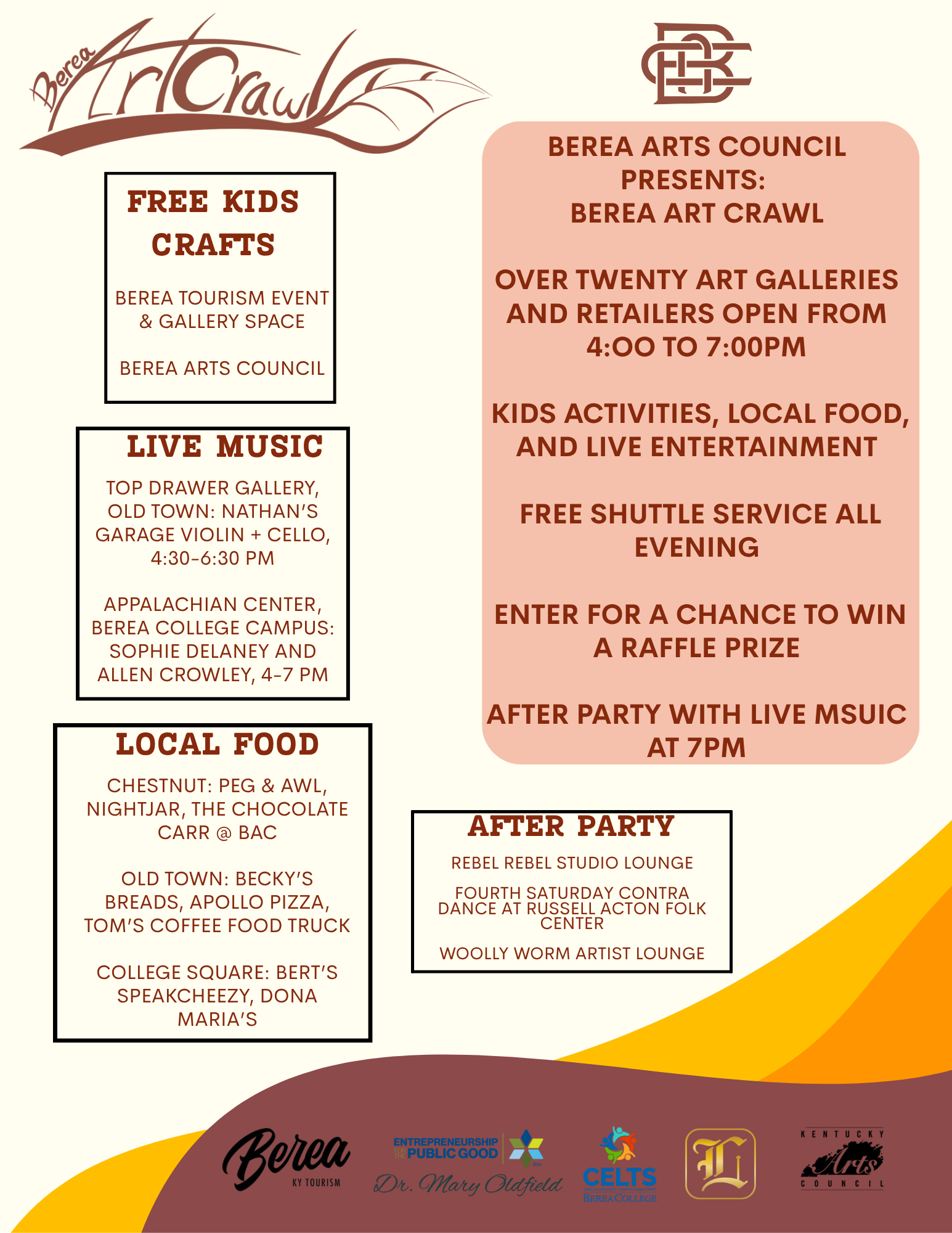 Bring your friends, bring your family, and come celebrate the amazing art community right here in Berea. You won't want to miss this art-filled night!